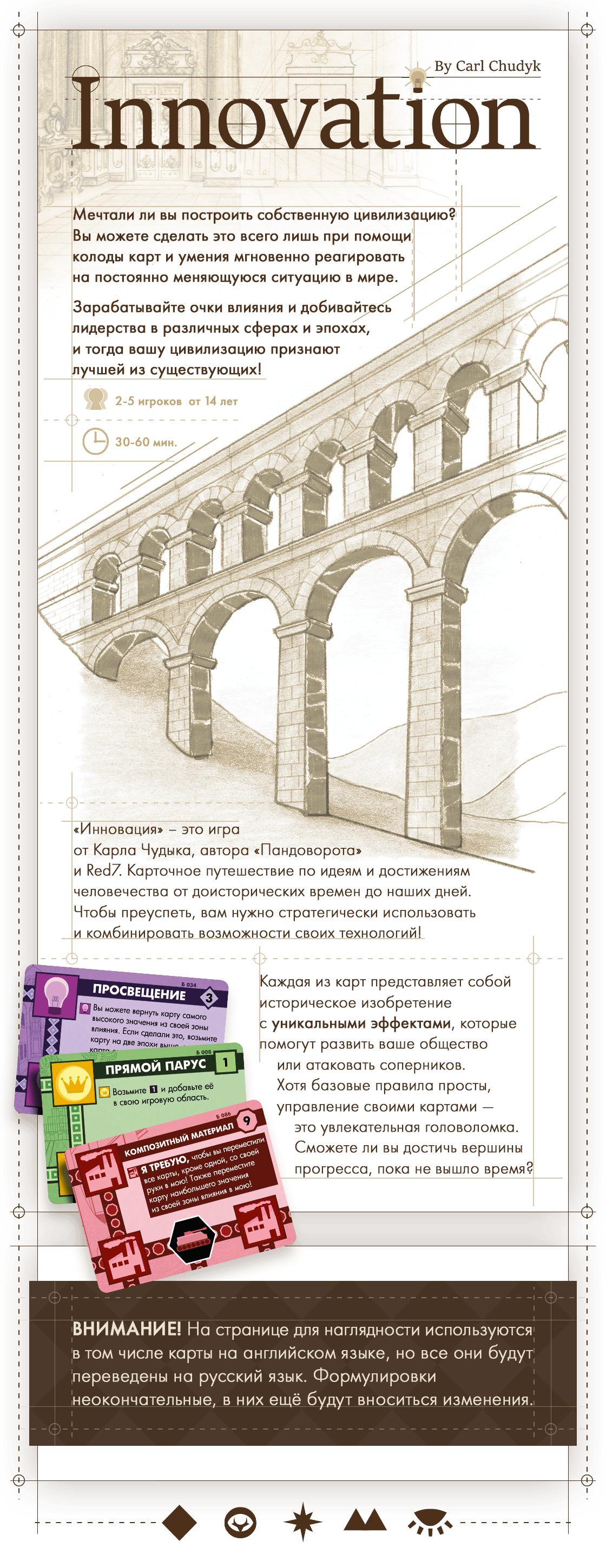 Innovation – это карточная цивилизация, где каждая карта — уникальное изобретение или идея, которая меняет ход партии. И вы должны уметь мгновенно реагировать на постоянно меняющуюся ситуацию в игровой области соперников. Хотя базовые правила просты, управление своими картами — это увлекательная головоломка, над которой порой нужно сильно поломать голову. 11 эпох, различные сферы – множество событий, технологий и личностей. Реиграбельность огромная даже у базовой игры, не говоря уже о 5 дополнениях, в каждом из которых по 115 карт.