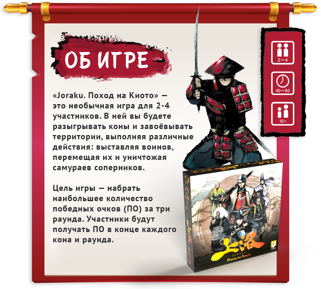 «Joraku. Поход на Киото» — это игра с контролем территорий. Перехитрите своих противников в этой тактической игре, используйте своих верных самураев, чтобы контролировать территории и повышать престиж. Только даймё с высочайшей репутацией сможет править Японией!