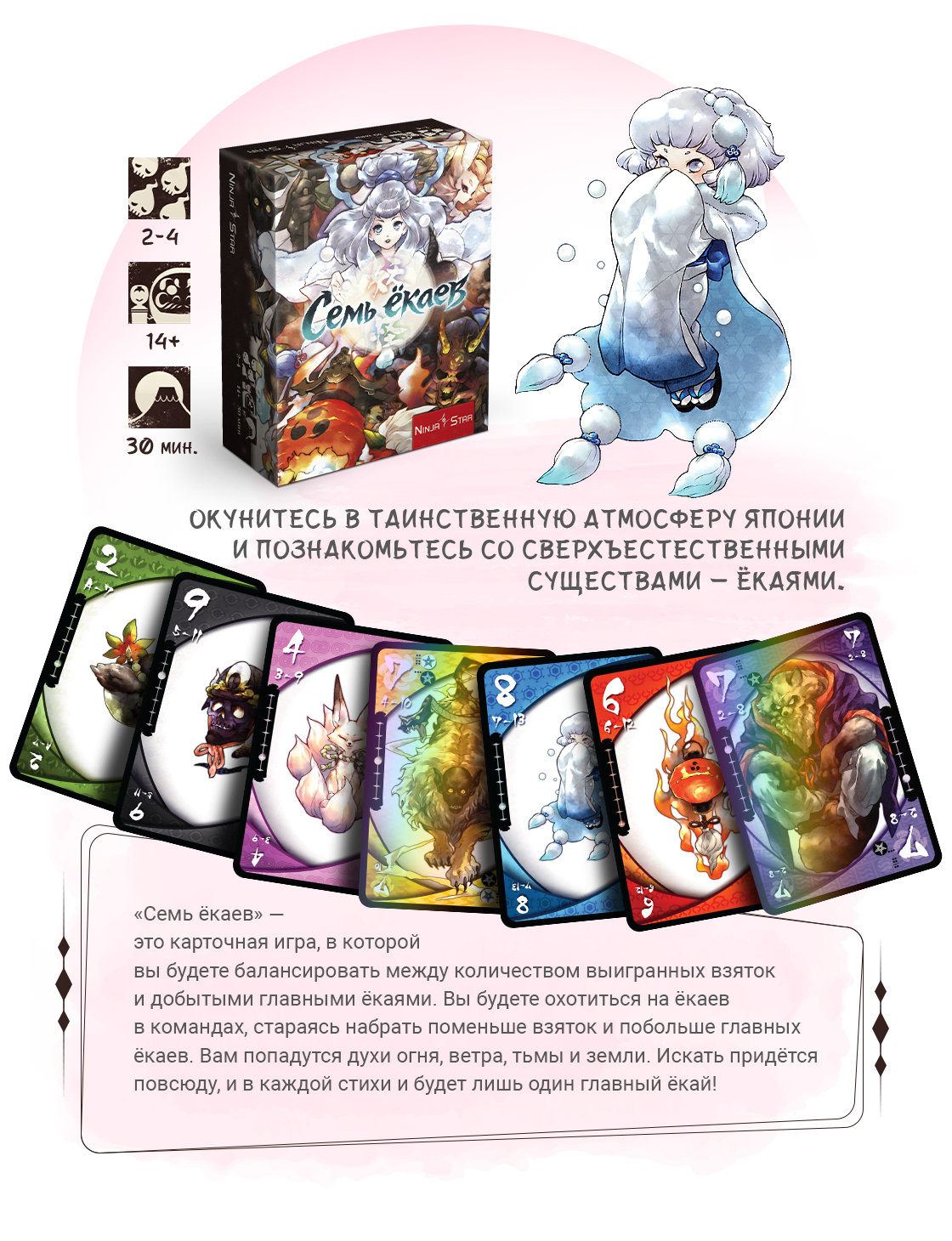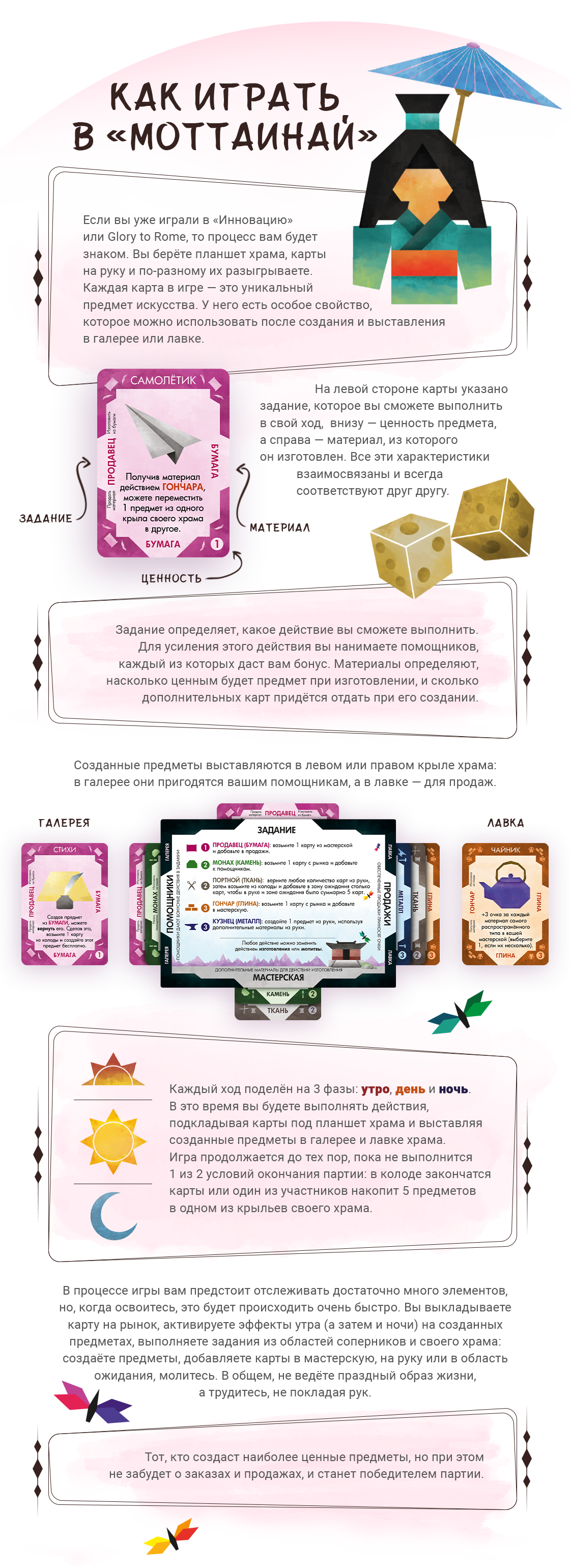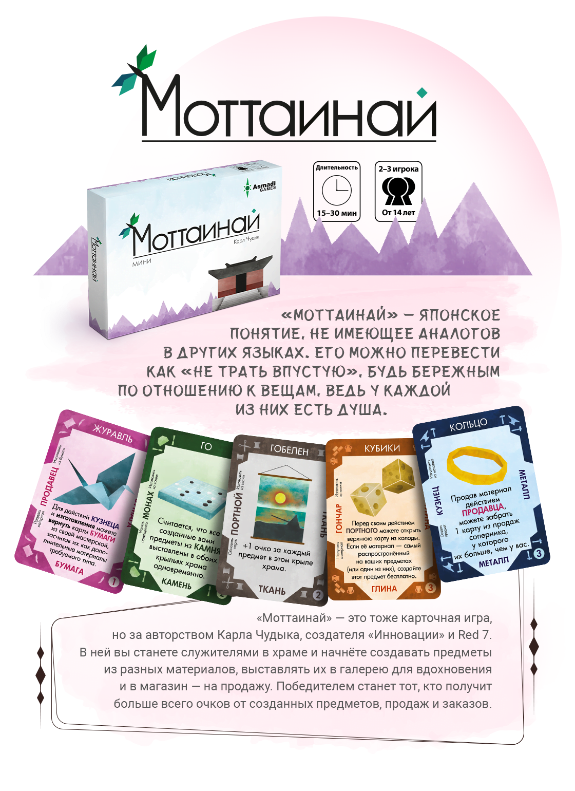 Эта игра Карла Чудыка («Пандоворот», «Инновация», Red 7) поведает вам о самой природе и вещах, в которых обитают духи. «Моттаинай» — это японская концепция сожаления о потраченном впустую. Игра научит вас видеть красоту в простых вещах, ценить их и находить гармонию в этом мире.